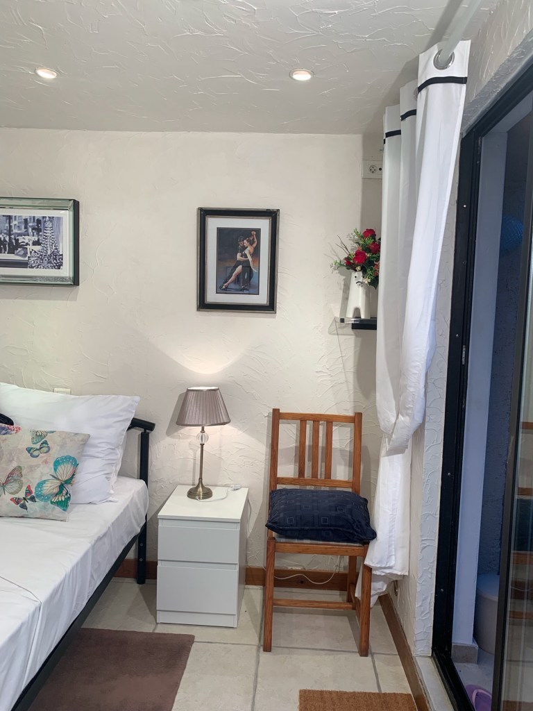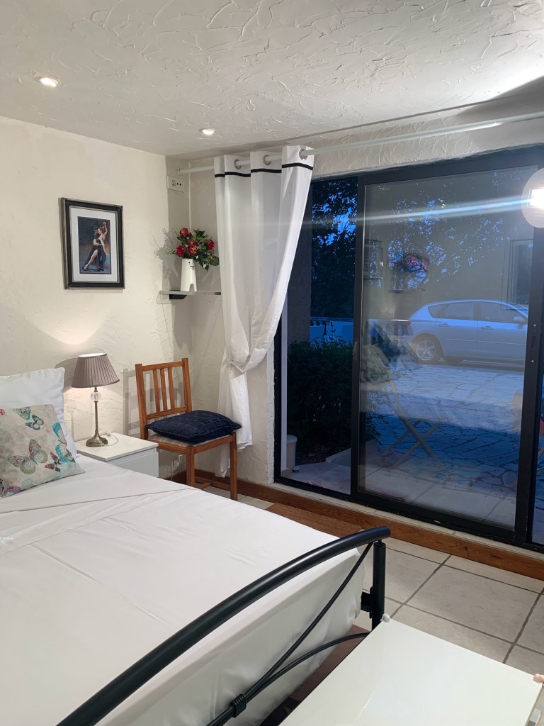 Accessed through its own sliding patio French doors, the space feels private and quietly glamorous, perfect for guests who appreciate simplicity with a touch of charm.