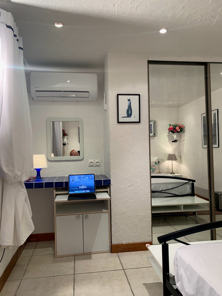 Outside, a small patio with a bistro table and chairs sits behind a living bamboo screen, creating a secluded corner for morning coffee or an evening glass of wine. It’s your chance to enjoy “breakfast at Tiffany’s” — Provence style.